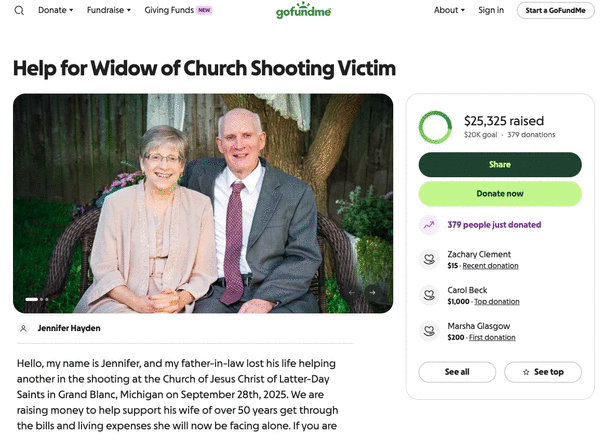 "My father-in-law lost his life helping another in the shooting at the Church of Jesus Christ of Latter-Day Saints in Grand Blanc," she wrote on the page. "We are raising money to help support his wife of over 50 years get through the bills and living expenses she will now be facing alone. If you are able to contribute, anything would be a great blessing. We believe that the Lord amplifies our efforts. Thank you."
