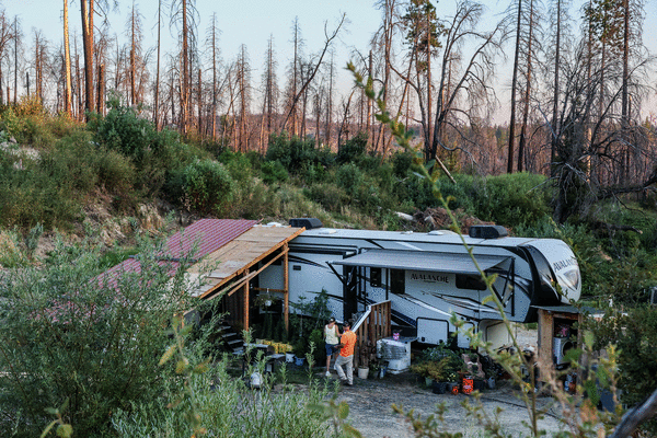 A Times analysis has found that only about 5% of the homes that were burned have been rebuilt, the lowest percentage of major fires in the state over the last eight years by a gigantic margin. Hundreds of residents left, never to return. Some concluded it was foolhardy to even consider rebuilding in such a fire-prone place. But hundreds more stayed — and without homes, people have been camping out year after year amid a fire-denuded landscape in mobile homes and lean-tos. About 80% of the children at Berry Creek School still bed down each night in an RV or mobile home, according to Patsy Oxford, the former school superintendent. They wake up each morning to reminders of apocalypse: blackened stumps and ghostly bare branches where a tree canopy used to be, and bald rocks and makeshift shelters where homes used to stand.