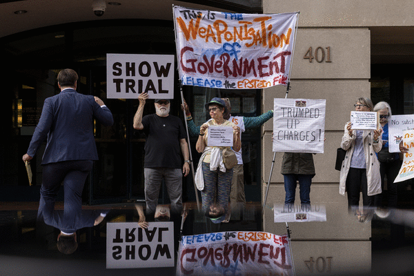 Outside the courthouse, a crowd of journalists gathered for a possible sighting of Comey to enter the courthouse, along with activists holding signs criticizing the case.