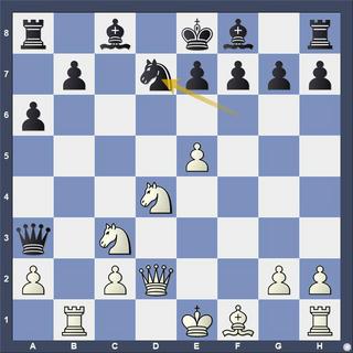 The queen chase at the end is classic. 13.Nd5!! Qc5 14.Nb3 Qc6 15.Na5 Qc5 16.Nxb7 Qc6 17.Rb6 1–0