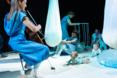 “Then we move through the first space, which allows the babies to adjust to some new lights and sounds, and also let the adults have a moment to leave the busy world behind them. There’s a big net overhead that has little soft strings hanging down from it, evoking rain. And then from there we move into the main space, which is where the cellist is, so we start to hear some beautiful cello music. There’s a big white rug and overhead there are pieces that hang down and look like raindrops. There is space for families to sit down on the rug as the performers move through the cycle of a rainstorm, and the performers are interacting with the babies and the elements of the installation while they’re doing that. And then afterwards, families are free to explore the space with their little one. The performers are still around, the cello is still playing. There are some mirrored puddles on the ground, for example, that babies love to look into, and other elements they can interact with.”