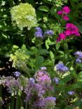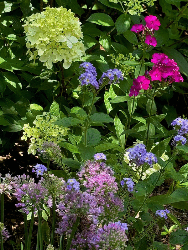 Then I’ve been adding shrubs like Miss Molly butterfly bush on each end of the bed and more perennials like Augusta Lavender heliotrope, Serendipity ornamental allium and Luminary phlox varieties Prismatic Pink and Ultraviolet. I’ve squeezed in a blue ceramic glazed bird bath and usually work in some chartreuse colored ColorBlaze coleus like Lime Time or Mini Me Chartreuse.