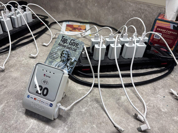 Chávez said those devices were sent back to be traded for $20 devices, one per basket, and the only option to tap for collection during mass. The one amount per device is intentional so that it doesn’t slow down the basket moving around, he said.