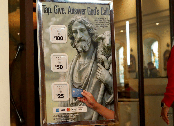 Saint Charles also has several kiosks located in the church vestibule and at certain exit doors where people can tap in $100, $50 and $25 denominations.