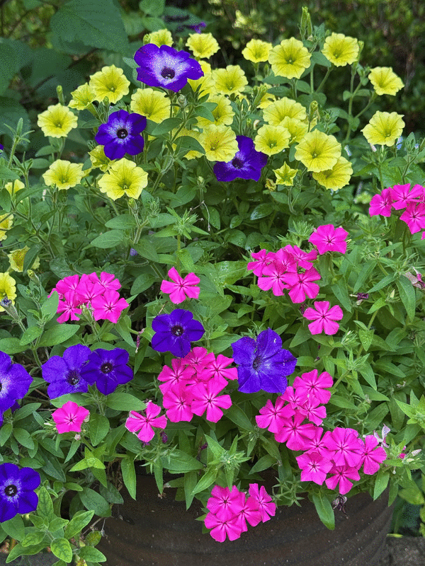 The Garden Guy created a mix last year again with a three-part harmony that was colorful and a little less flamboyant but not much. I used Supertunia Tiara Blue and Supertunia Mini Vista Yellow petunias, along with Southern Blaze Bright Pink phlox. This phlox is making its debut this spring.