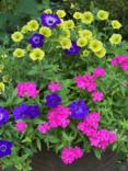 Perhaps you think the Prime Time recipe is a little rich or saturated for your color palette. Then you might like what my neighbors Dave and Cynthia did. In a rectangular concrete planter, they used Supertunia Vista Jazzberry, Supertunia Mini Vista Yellow and Augusta Lavender heliotrope to give height to the design. Again, this was a beautiful example of triadic harmony with a different twist.