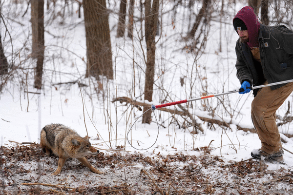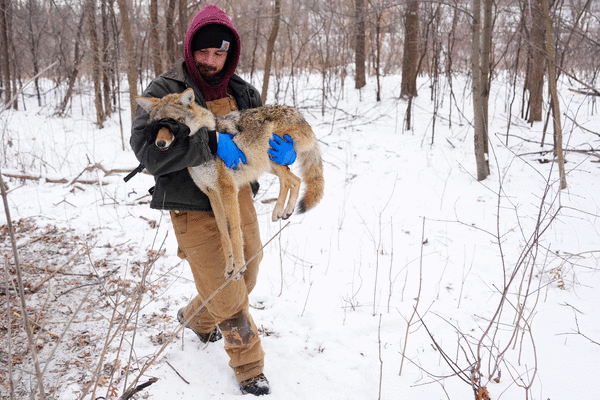 Miller cradled the young coyote, wrapped her in a blanket and put her inside a portable dog crate while he waited for her to wake up. It was late February, and the animals can struggle to keep their body temperatures up when they’re sedated. He keeps packs of handwarmers around, just in case. If that doesn’t work, he will bring the animal inside the cab of his heated truck.