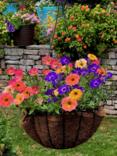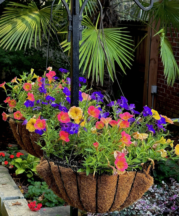 The baskets look like twins as I gave the Supertunia Persimmon partners of other Supertunia petunias. The combinations have Supertunia Honey and Tiara Blue petunias They look like a floral version of Skittles candy.