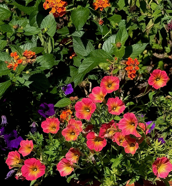 So right now, in west Georgia, the fall colors are riveting. Not the trees yet but Luscious Marmalade and Basket Tangeglow lantanas, as well as Supertunia Persimmon, Honey, Tiara Blue and Mini Vista Indigo petunias. The Superbena verbenas are coming on strong.