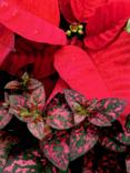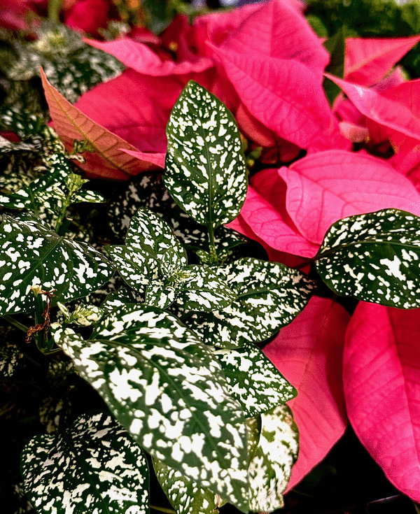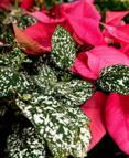 There are some other great opportunities for combinations with the Hippo Polka Dot plants. The Polka Dot plants are known botanically as Hypoestes phyllostachya, which is where the cute Hippo variety-name originates. They come in red, rose and white. The white with the green variegation is showy and of high contrast, perfect with red poinsettias.