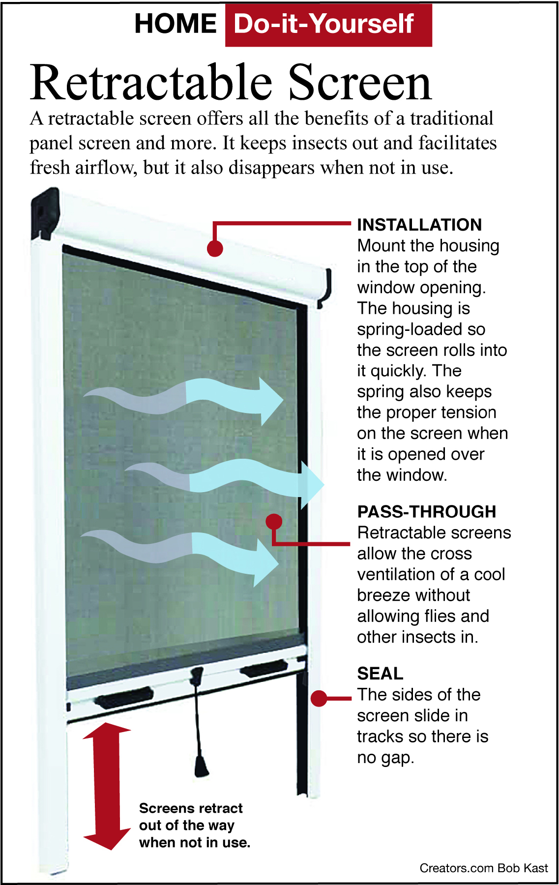 Dear James: It is a hassle putting up and taking down window screens. Do retractable window screens block bugs as well, and are there larger ones to replace screen doors? -- Brooke H.