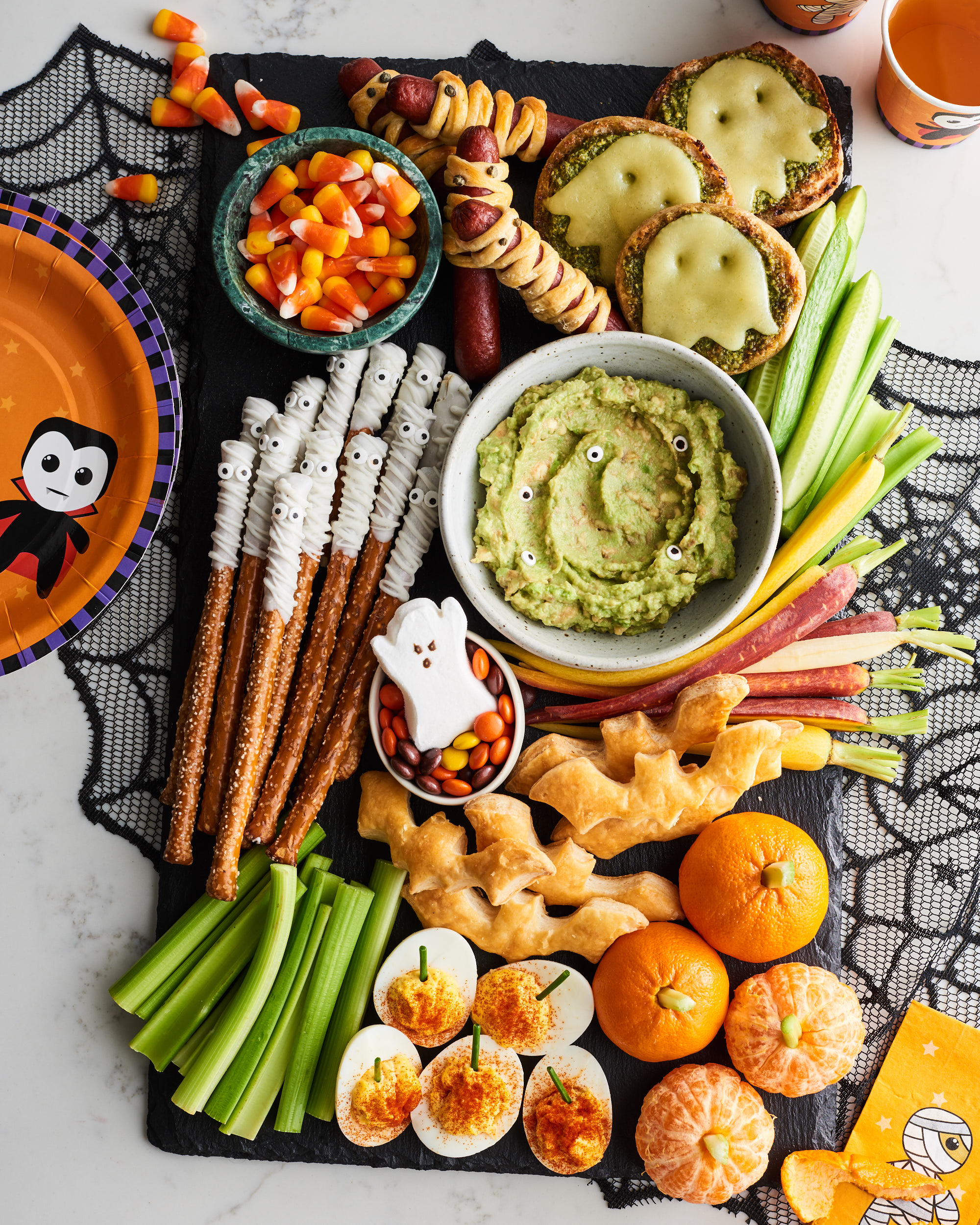 Your snack board should be a good mix of easy homemade recipes, store-bought staples, and special treats. Be sure to include two or three more substantial snacks (like the mummy pigs in a blanket or English muffin pizzas) to ensure everyone fills their bellies ahead of all the candy.
