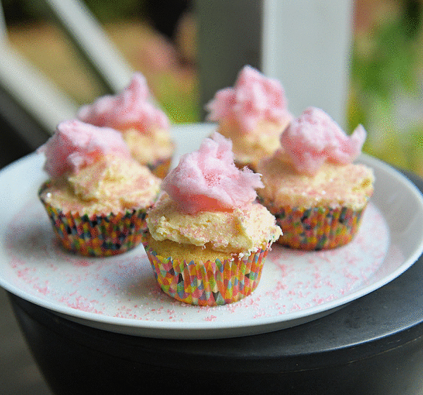 Once the cupcakes are completely cool, apply frosting with a piping bag or a spatula and decorate with cotton candy and sprinkles.