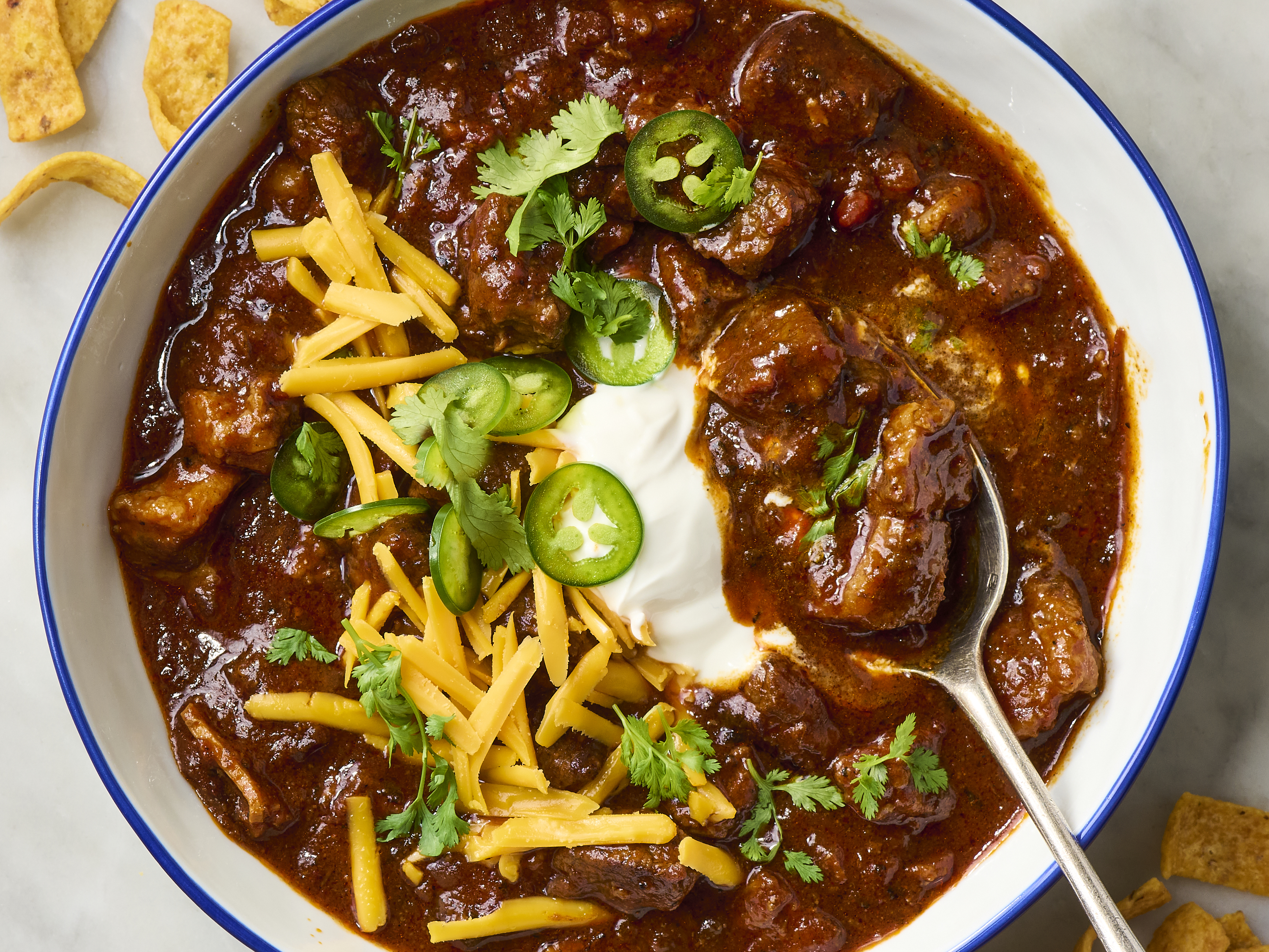 In a nod to the barbecue I grew up eating in Texas, I like to infuse the chili with some smoky elements: Bacon, smoked paprika, and some canned chipotle peppers in adobo sauce add a layer of smoked flavor. It doesn’t exactly scream barbecue, but it’s certainly a nod to the classic Texas flavors. Then, it’s all about how you top it. I’m always partial to a combination of corn chips, cheddar cheese, and sour cream, but there are nearly endless toppings to choose from.