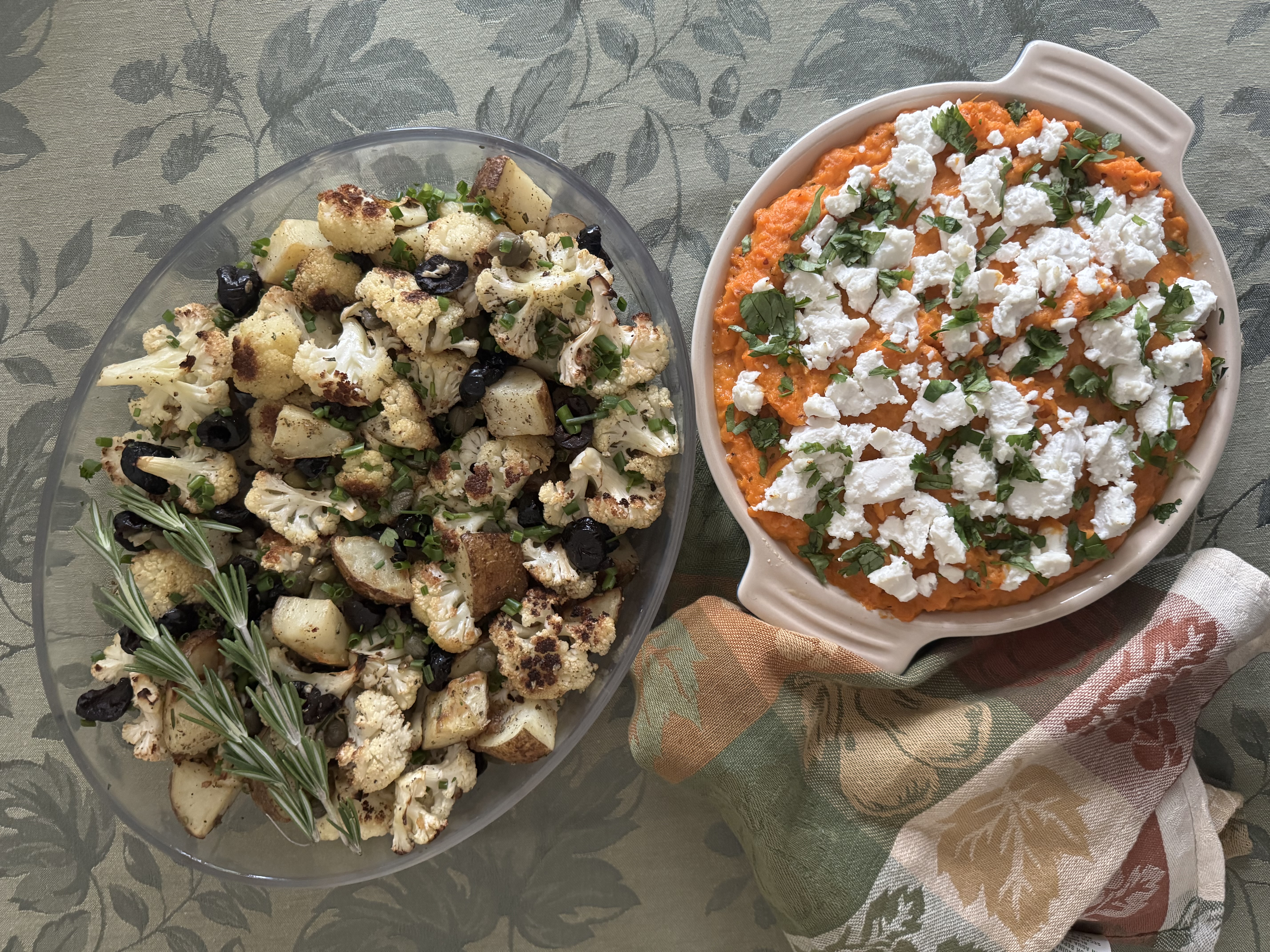 Since our fall travels to Greece, we’ve been adding olive oil and Greek oregano to everything. Little wonder then that we’re roasting potatoes and cauliflower with ample amounts of both. A generous addition of oil-cured olives and briny capers keeps the roasted veggies from tasting too rich.